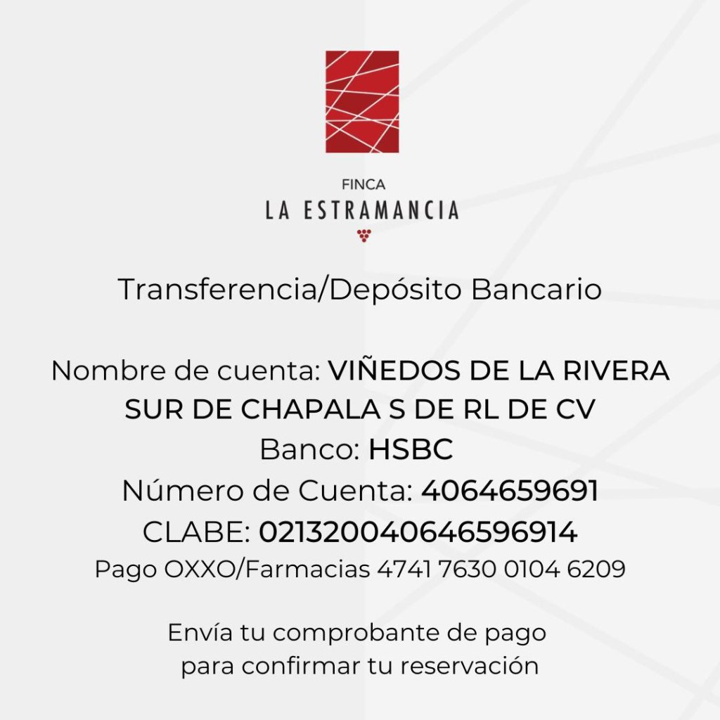 The required reservation MUST be secured with a 3,000 pesos wire to the vineyard. The balance collected upon arrival. To make Vineyard deposit: Pay via bank transfer, at HSBC at Laguna Plaza bank. Secure date with deposit 20 days prior. Pay deposit to reserve the date desired. WhatsApp Vineyard the bank receipt.