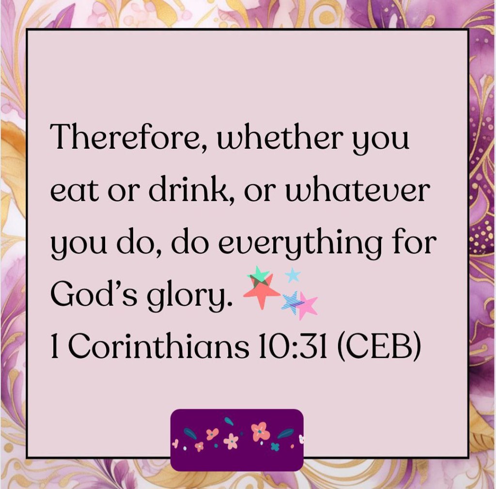 The Lord says “whatever eat or drink” matters to Him. For those who desire to be obedient to God, that Scripture should be very convicting. ”Whatever we CHOOSE to DO” are we choosing to glorify God or to satisfy our selfish nature? The Lord made a huge sacrifice to save us. He denied Himself the pleasure of remaining in heaven to come down to earth and be rejected, beaten and live in a tent without all the comforts of home. He did this to take away our deserved punishment. Our Father continues to work on our behalf, with our bold declaration, by the authority He gave us, He turns back our enemy. The Lord, the King of kings, the Mighty Warrior who saves takes great delight in us. “He rejoices over us with singing.” Zephaniah 3:17