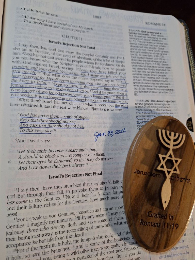 Romans 11 “Did they stumble so as to fall beyond recovery? Not at all! Rather, because of their transgression, salvation has come to the Gentiles to make Israel envious. For IF their REJECTION brought RECONCILIATION to the world, what will their ACCEPTANCE be but LIFE from the DEAD? If some of the branches have been broken off, and you, though a WILD olive SHOOT, have been GRANTED in among the others and now share in the nourishing sap from the olive root, do NOT consider yourself to be SUPERIOR to those other branches. If you do, consider this: You do NOT support the root, but the ROOT supports you. You will say then, “Branches were broken off so that I could be grafted in.” Granted. But they were BROKEN OFF because of UNBELIEF, and you stand by FAITH. Do NOT be ARROGANT, but TREMBLE. For if God did NOT SPARE the natural branches, HE will not spare you either. Consider therefore the KINDNESS and STERNNESS of God: STERNNESS to those who fell, (to those who did not seek God with all their heart) but kindness to you, PROVIDED that you continue in HIS kindness. Otherwise, you also will be cut off. And if they do NOT persist in UNBELIEF, they will be GRAFTED in, for GOD is ABLE to graft them in again. After all, IF you were cut out of an olive tree that is WILD by nature, and contrary to nature were GRAFTED into a cultivated olive tree, how much MORE READILY will these, the NATURAL branches, be GRAFTED into their own olive tree! I do NOT want you to BE IGNORANT of this MYSTERY, brothers and sisters, so that you may NOT be CONCEITED: Israel has experienced a hardening in part until the full number of the Gentiles has come in, and in this WAY all ISRAEL will be SAVED. As it is written: “The deliverer will come from Zion; HE will turn godlessness away from Jacob. And this is MY covenant with them when I take away their sins.” As far as the GOSPEL is concerned, they are ENEMIES for your sake; but as far as ELECTION is concerned, they are LOVED on account of the patriarchs, for God’s GIFTS and HIS CALL are IRREVOCABLE. Just as you who were at one time DISOBEDIENT to God have now received MERCY as a result of their disobedience, so they too have now become disobedient in order that they too may now receive mercy as a result of God’s mercy to you. For God has BOUND EVERYONE over to disobedience so that HE may have MERCY on them all. Oh, the DEPTH of the RICHES of the WISDOM and KNOWLEDGE of GOD! How unsearchable HIS judgments, and HIS paths beyond tracing out! “Who has KNOWN the MIND of the Lord? Or who has been HIS counselor? Who has ever given to God that God should repay them? For from HIM and through HIM and for HIM are all things. To HIM be the glory forever! AMEN