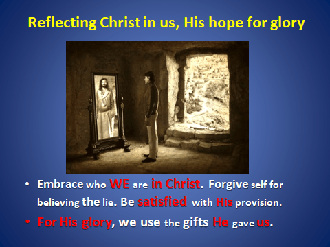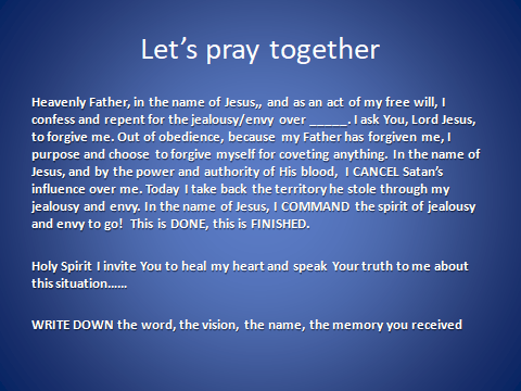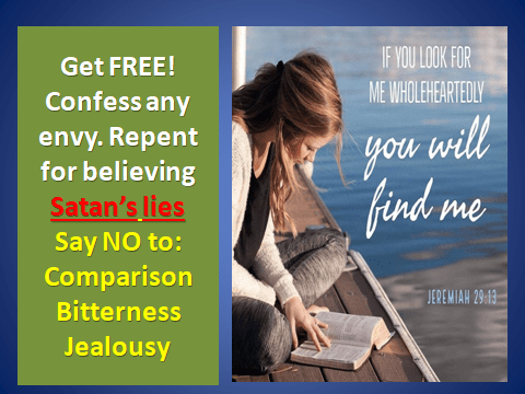 Oh Lord, we praise YOU for there is none like YOU. We purpose and CHOOSE the GLORY of GOD as we look upon all that You created! We know our enemy, Satan and how he pits us against one another. By the blood of the Lamb, Satan is DEFEATED and when ENVY or JEALOUSY is recognized in us or in the speech of another, we STAND in VICTORY and begin to PRAISE GOD for the BLOOD of JESUS. Today we will STUDY our SOUL’s enemy in order to DEFEAT him. We are overcomers by His blood and the word of our testimony. As we speak truth and PRAISE GOD, we REPEL all that whispers doubt, envy or jealousy.